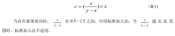 測定待測試樣的吸光度為A,從校準曲線上查得濃度為x。再向待測試樣中加入標(biāo)準溶液,加標(biāo)濃度為s,測定其吸光度為B,從校準曲線上查得濃度為y。按照公式(B.1)計算待測試樣的濃度c: