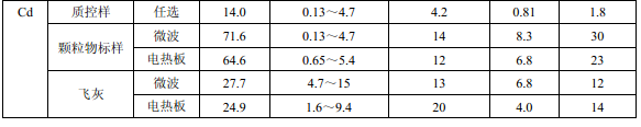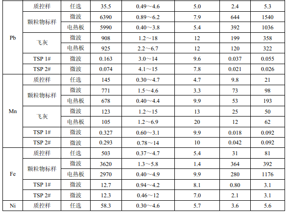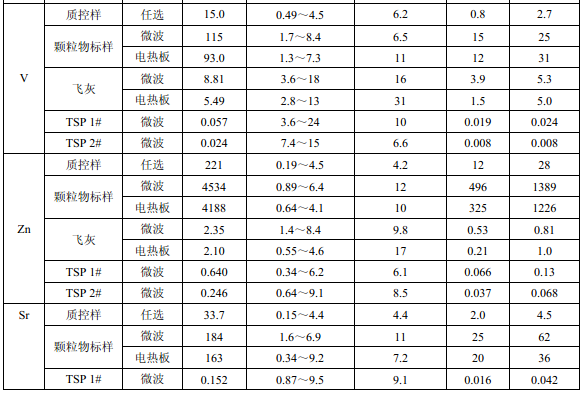 濾膜質(zhì)控樣品由美國(guó)職業(yè)健康研究所提供(A-3.1)。顆粒物標(biāo)樣為美國(guó) NIST(1648a)。 樣品消解處理采用硝酸-鹽酸混合溶液(5.6),定容體積為 50.0 ml。不同類(lèi)型樣品測(cè)定值濃 度(或含量)單位分別為:質(zhì)控樣(μg )、顆粒物標(biāo)樣(μg/g)、飛灰樣品(μg/g)和 TSP 樣品(μg/cm 2 )。其中顆粒物標(biāo)樣中 Al 、Ca、K 元素含量單位為重量百分比(% )。