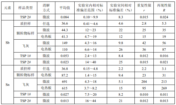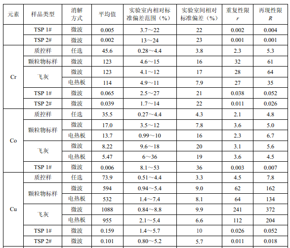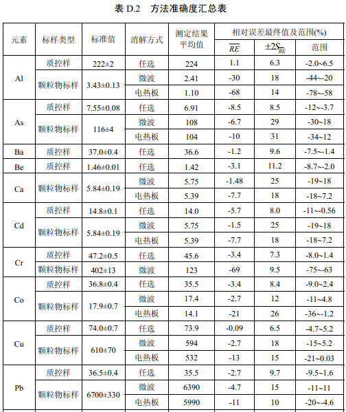 7家實(shí)驗(yàn)室分別對(duì)統(tǒng)一提供的大氣顆粒物標(biāo)樣、濾膜質(zhì)控樣品、飛灰樣品(廢氣顆粒物模擬樣品)和2 個(gè)顆粒物負(fù)載量不同的TSP 樣品,同時(shí)取6 份平行樣品分別進(jìn)行微波消解 (7.2.1.1 )和電熱板消解(7.2.1.2 ),用等離子體發(fā)射光譜法測(cè)量。對(duì)測(cè)定結(jié)果進(jìn)行數(shù)理統(tǒng) 計(jì),得到方法的精密度(各元素測(cè)定值的實(shí)驗(yàn)室內(nèi)標(biāo)準(zhǔn)偏差范圍、實(shí)驗(yàn)室間標(biāo)準(zhǔn)偏差、重復(fù) 性限和再現(xiàn)性限)和方法的準(zhǔn)確度(各元素測(cè)定值的相對(duì)誤差范圍和相對(duì)誤差最終值),詳 見(jiàn)附錄D。