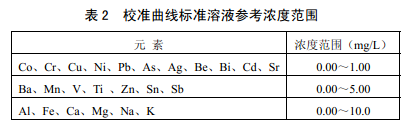基于顆粒物樣品實(shí)際化學(xué)組成,表2 給出了標(biāo)準(zhǔn)溶液濃度參考范圍。建議在此范圍內(nèi)除 標(biāo)準(zhǔn)系列空白溶液(5.9),依次加入多元素標(biāo)準(zhǔn)儲(chǔ)備液(5.13 )配制3 ~5個(gè)濃度水平的標(biāo)準(zhǔn)系列。各濃度點(diǎn)用硝酸溶液(5.9)定容至50.0 ml??筛鶕?jù)實(shí)際樣品中待測(cè)元素濃度情況調(diào) 整校準(zhǔn)曲線(xiàn)濃度范圍。