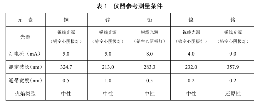 土壤和沉積物經(jīng)酸消解后,試樣中銅、鋅、鉛、鎳和鉻在空氣-乙炔火焰中原子化,其基態(tài)原子分別對銅、鋅、鉛、鎳和鉻的特征譜線產(chǎn)生選擇性吸收,其吸收強度在一定范圍內(nèi)與銅、鋅、鉛、鎳和鉻的濃度成正比。