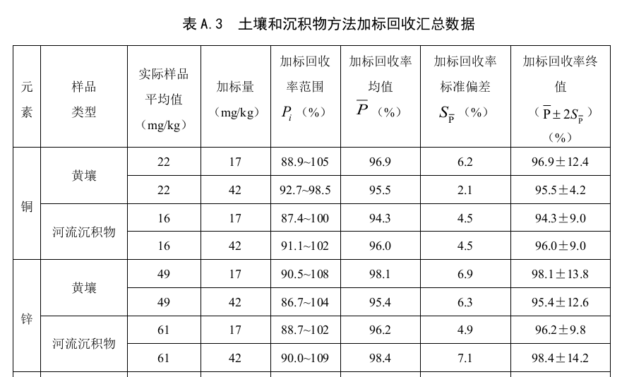 六家實驗室分別對加標量為17 mg/kg和42 mg/kg的含鋅為61 mg/kg的河流沉積物樣品進行了6次重復測定:加標回收率范圍分別為88.7%~102%和90.0%~109%,加標回收率最終值分別為96.2%±9.8%和98.4%±14.2%。