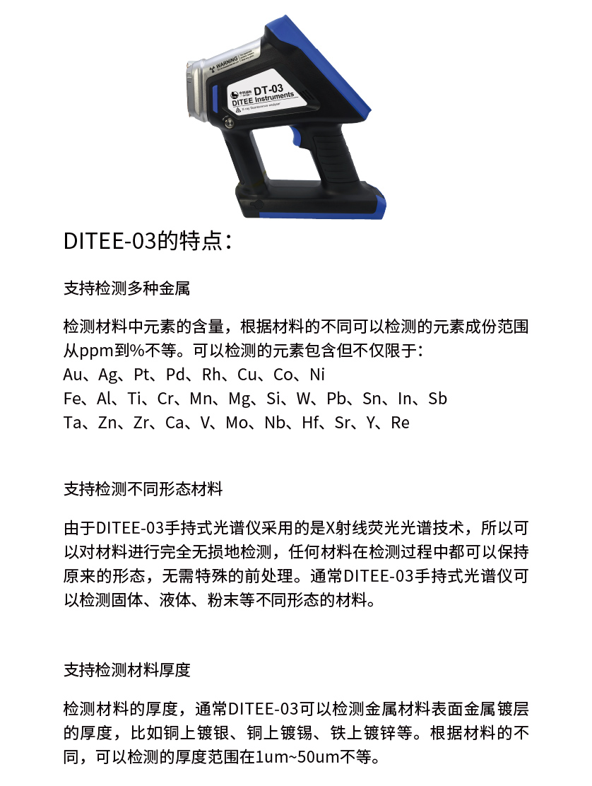 由于DITEE-03手持式光譜儀采用的是X射線熒光光譜技術(shù),所以可以對材料進(jìn)行完全無損地檢測,任何材料在檢測過程中都可以保持原來的形態(tài),無需特殊的前處理。通常DITEE-03手持式光譜儀可以檢測固體、液體、粉末等不同形態(tài)的材料。