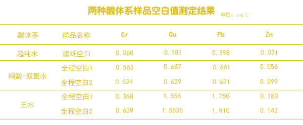 釆用硝酸-雙氧水和王水消解土壤和底泥樣品,由于沒有加氫氟酸飛硅的步驟,因此消解液中留有殘渣,用中性濾紙過濾后定容,因此濾紙空白值的大小直接影響方法檢岀限和測定結(jié)果。本研究對兩種體系均進行了空白值實驗,表(兩種酸體系樣品空白值測定結(jié)果)中的結(jié)果表明該前處理體系試劑空白低,可以適用于浸提。
