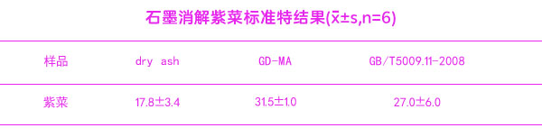 分別采用石墨消解灰化法(GD—MA)和GB/T5009.11—2003中總砷的干灰化法(dryash)處理樣品,測定紫菜(GBW10023)成分分析標(biāo)準(zhǔn)物質(zhì)中總砷含量,結(jié)果見表【石墨消解紫菜標(biāo)準(zhǔn)物結(jié)果】。