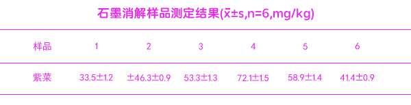 采用上述的方法對紫菜(各6份)進行測定,測定結(jié)果為3次測定的平均值及標(biāo)準(zhǔn)偏差范圍,結(jié)果見表【石墨消解樣品的測定結(jié)果】。紫菜總砷含量范圍為33.5~72.1mg/kg。