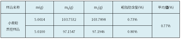 本次實(shí)驗(yàn)測(cè)得小麥粉質(zhì)控樣品中的粗脂肪含量為0.77%,符合該質(zhì)控樣品粗脂肪特性值要求(0.6~1.0%)。