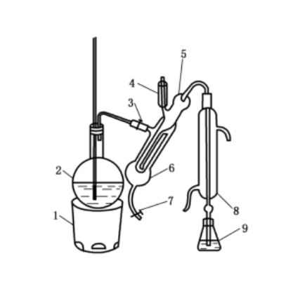5.1.3 向接收瓶內(nèi)加入10.0 mL硼酸溶液及1滴~2滴混合指示液(B)并保持滿瓶,并使冷凝管的 下端插入液面下,根據(jù)試樣中氮含量,準(zhǔn)確吸取2.0 mL~10.0 mL試樣處理液由小玻杯注入反應(yīng)室,以10 mL水洗滌小玻杯并使之流入反應(yīng)室內(nèi),隨后塞緊棒狀玻塞。將10.0 mL氫氧化鈉溶液倒入小玻杯,提起玻塞使其緩緩流入反應(yīng)室,立即將玻塞蓋緊,并加水封。夾緊螺旋夾,開始蒸餾。蒸餾10 min 后移動蒸餾液接收瓶,液面離開冷凝管下端,再蒸餾1 min。然后用少量水沖洗冷凝管下端外部,取下蒸餾液接收瓶。以硫酸或鹽酸標(biāo)準(zhǔn)滴定溶液滴定至終點(diǎn),如用A混合指示液,終點(diǎn)顏色為灰藍(lán)色;如用B混合指示液,終點(diǎn)顏色為淺紅色。同時做試劑空白。